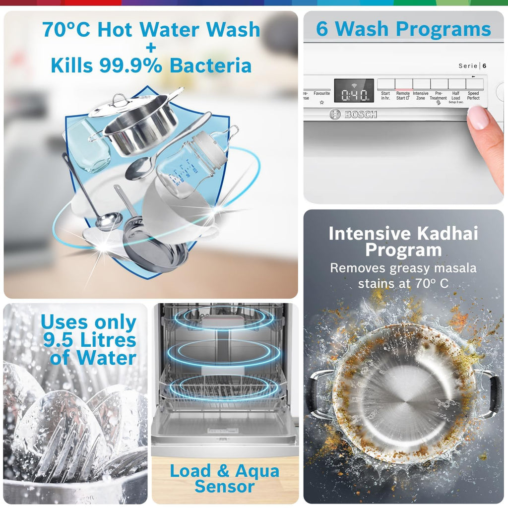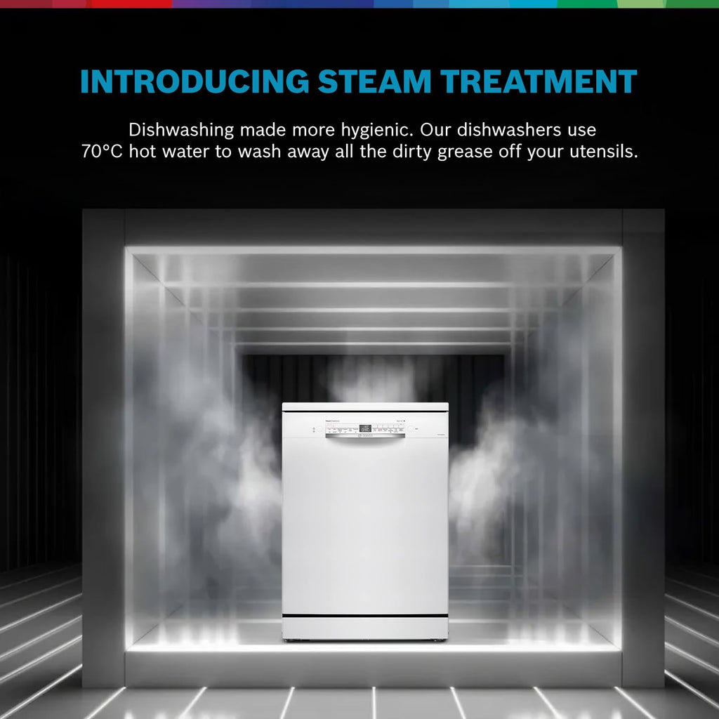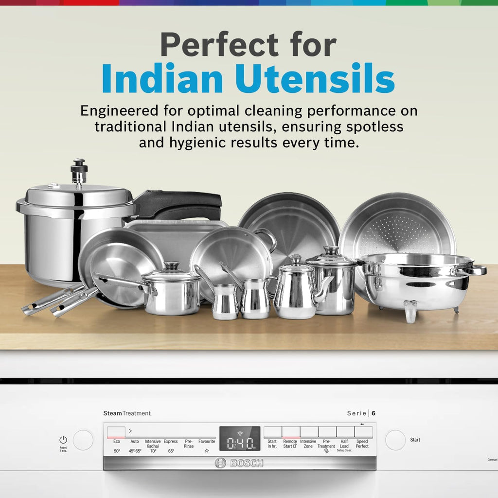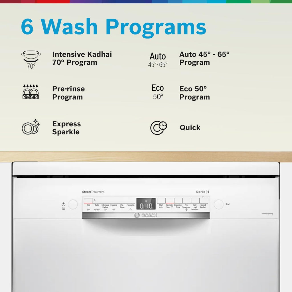 Bosch 14 Place Setting with intensive Kadhai Program, Steam Treatment,WiFi, 3-Stage Adjustable Upper Rack - (SMS6IKW01I - White,Glass Protection Technology)