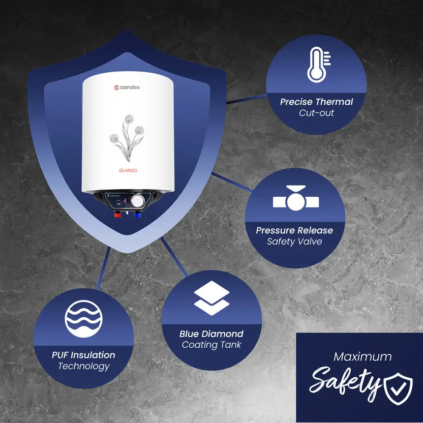 Key Features High-capacity 25 L storage water heater with corrosion-resistant glass-lined tank, pre-set thermal cut-out and auto cut-off for safety, LED indicators for power and heating status, all-purpose RPR safety valve, metal body with PUF insulation for heat retention