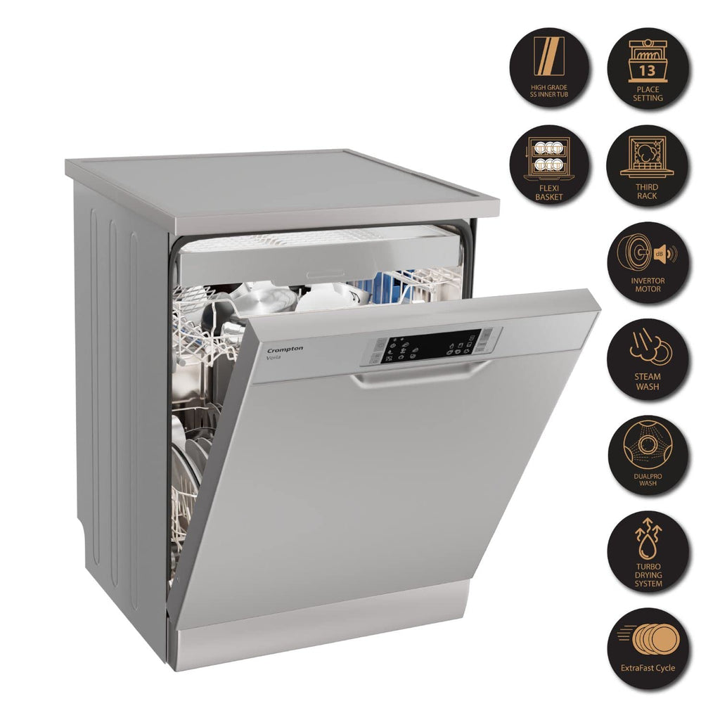 Crompton 13 Place Setting Freestanding Dishwasher with 8 Wash Programs and Turbo Drying Technology (Voilla 13 PS INX, Silver Inox, FS-DWVOV13PS-INX)