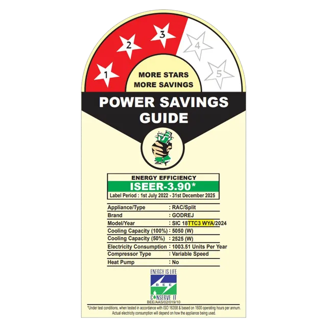 The Godrej SIC 18TTC3 WYA is a 1.5 Ton 3 Star inverter split air conditioner designed to deliver efficient cooling with I-Sense Technology. It features a convertible cooling mode that allows flexible operation based on room usage and conditions. The inverter compressor and copper condenser provide reliable performance and enhanced durability. Its split design makes it suitable for medium-sized rooms, offering comfortable and energy-efficient cooling for everyday use.