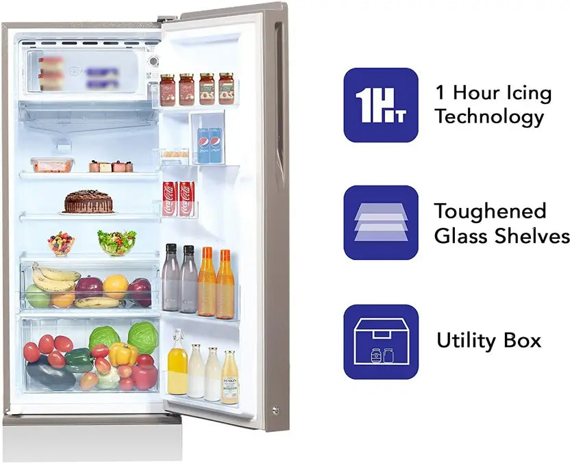 A stylish 185 L (approx. 190 L net) capacity single-door direct-cool refrigerator from Haier featuring a 5 Star energy rating, Mirror Glass finish with a base drawer, designed for efficient cooling and extra storage convenience.