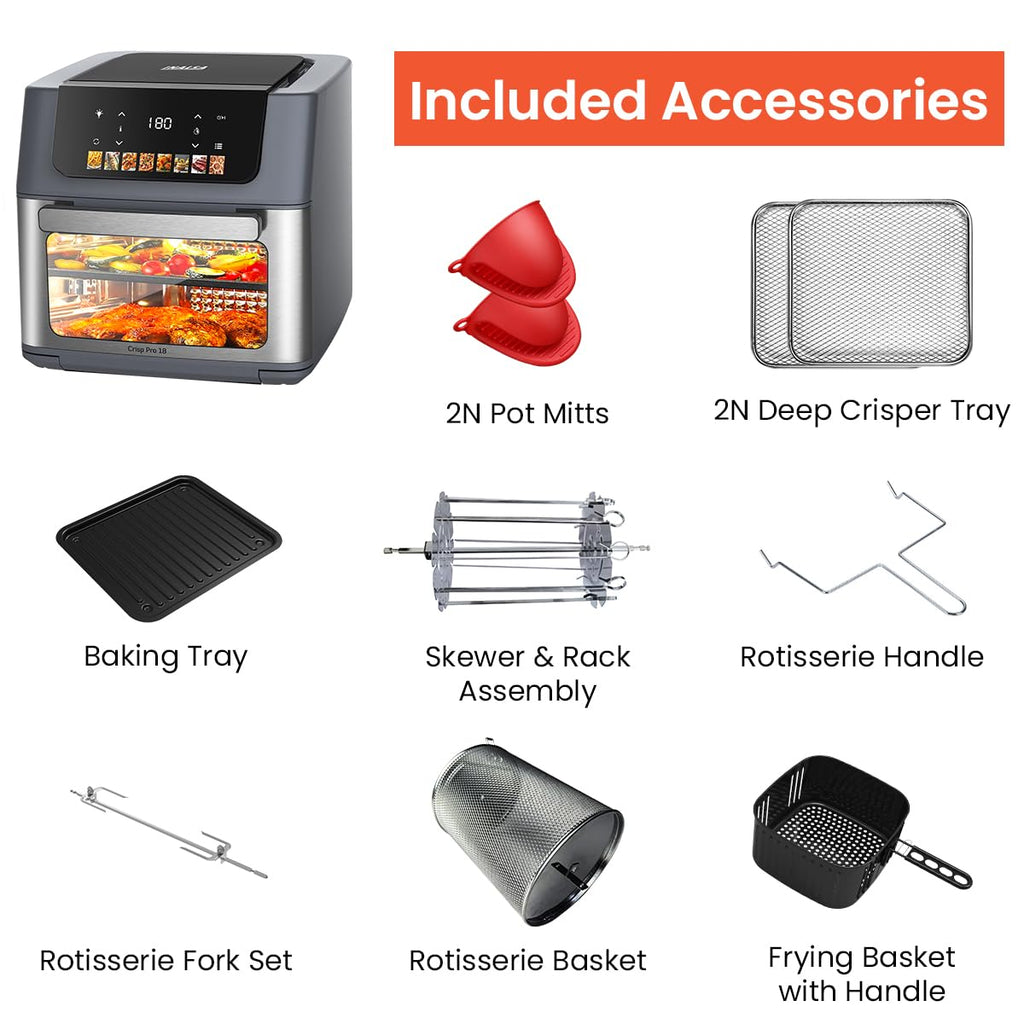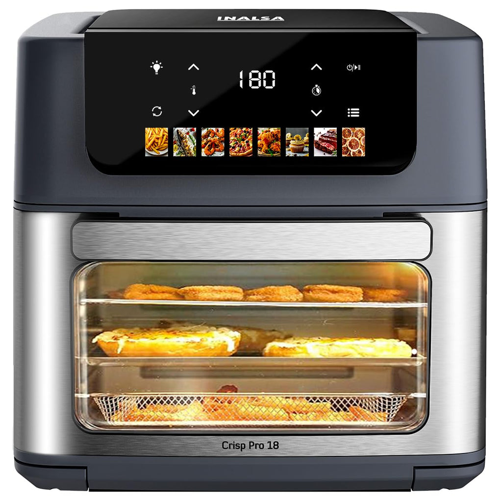 The INALSA Aero Crisp Pro18 is a 2100 W air fryer oven with an 18 litre capacity designed for versatile cooking. It features 8 preset functions including roast, reheat, dehydrate, and bake, along with rotisserie and convection functions for even cooking performance. Equipped with an LED touch display, it offers convenient control for everyday meal preparation.