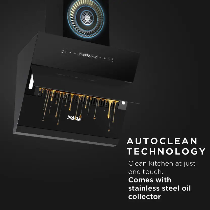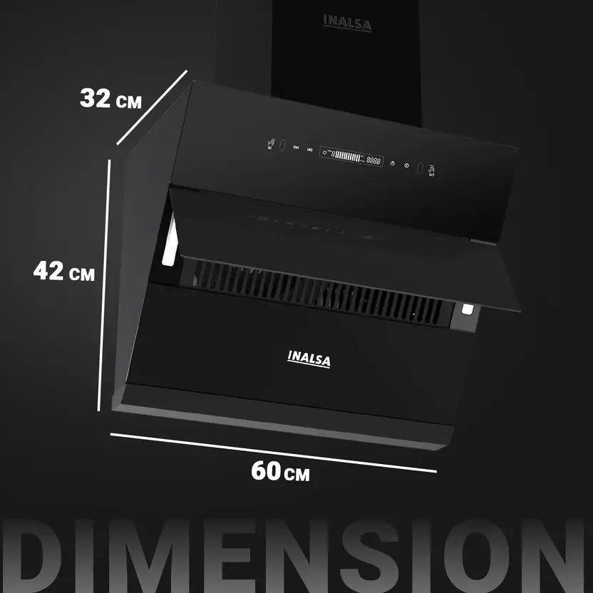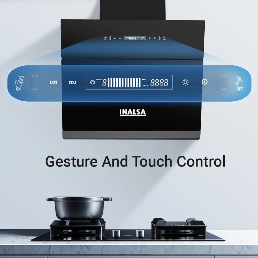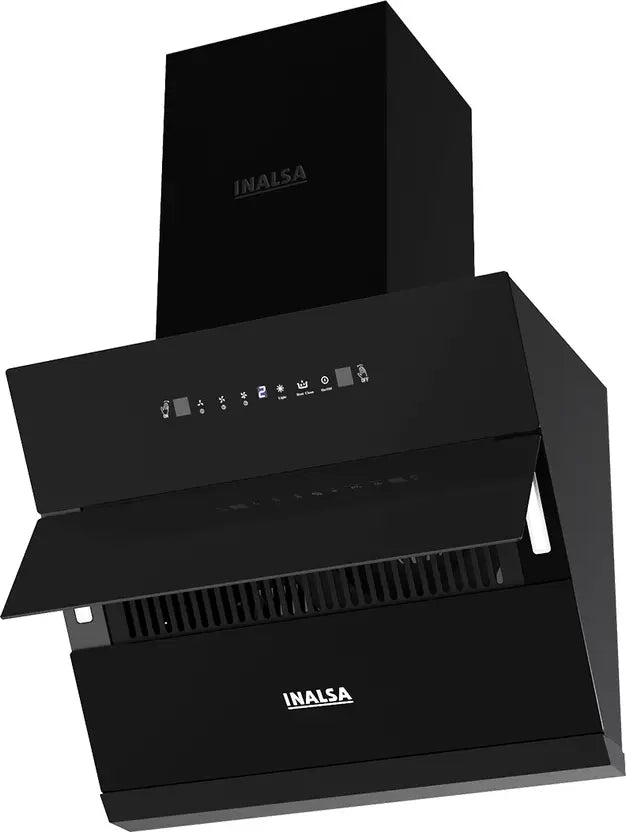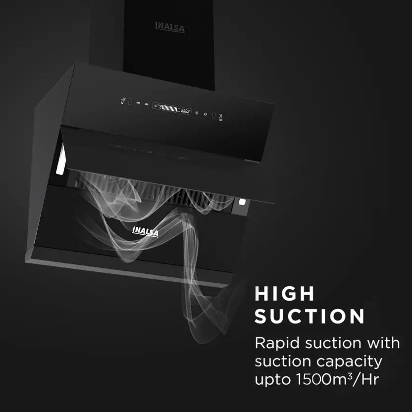 The Inalsa Maris 60BLDC is a wall-mounted chimney featuring auto-clean functionality, a filterless design, and a powerful 1500 CMH suction capacity. It delivers efficient smoke and odor removal with a quiet profile and convenience features like touch controls, motion sensor, and LED lighting. The black powder-coated hood with glass finish provides a modern aesthetic to complement contemporary kitchens.