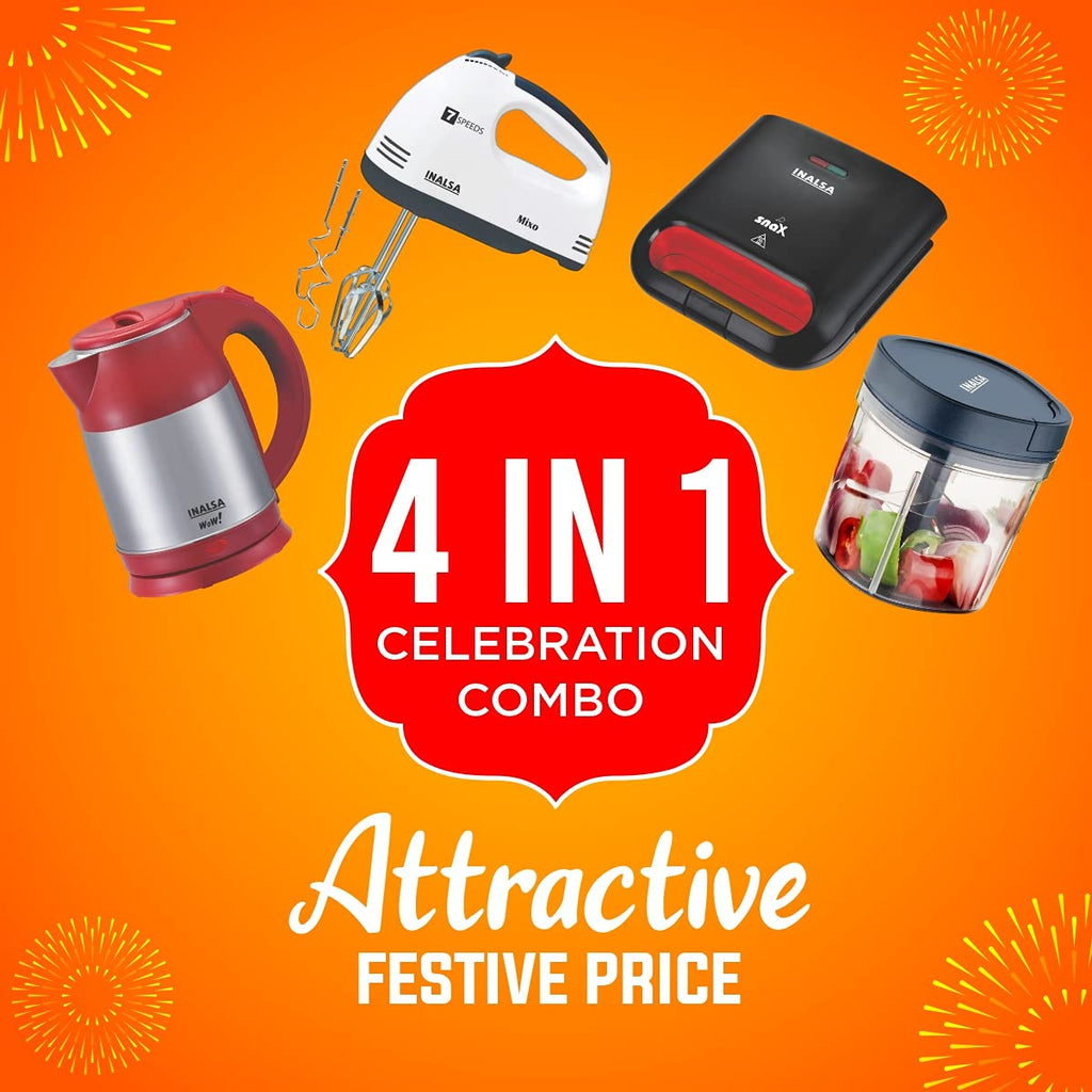 Bring home the INALSA Kitchen Essential Celebration Combo—a smart, space-saving kitchen solution featuring a 250 W hand mixer, 1500 W electric kettle, 900 ml mini chopper, and a powerful 750 W Phoenix sandwich toaster. Designed for efficiency and convenience, this all-in-one combo helps you seamlessly blend, boil, chop, and toast, making it the perfect companion for daily meals and festive occasions.