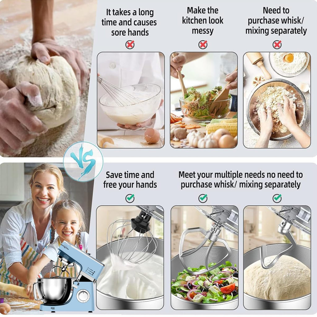 The INALSA Kratos Plus Stand Mixer in blue is powered by a 1200W pure copper motor designed for efficient mixing and kneading. It features a 5.3 litre stainless steel bowl with splash guard and durable metal gears for enhanced performance and longevity. Suitable for baking, cake mixing, and dough kneading, it comes with multiple accessories and dishwasher safe components for convenient use and cleaning.