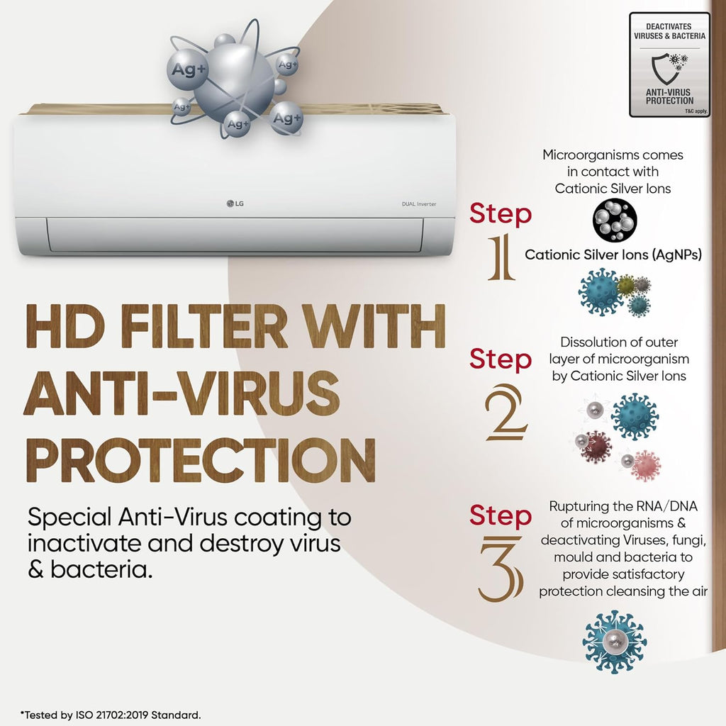 Experience intelligent and efficient cooling with the LG 1.5 Ton 5 Star Split AC featuring the AI Dual Inverter compressor. This advanced compressor adjusts its speed based on the room's heat load, offering faster cooling, significant energy savings, and quieter operation. The AI Convertible 6-in-1 Cooling gives you the flexibility to adjust cooling capacity from as low as 40% up to 110% (VIRAAT Mode), ensuring optimal comfort in various conditions while managing energy consumption. For enhanced air quality, it includes an HD Filter with Anti-Virus Protection, capturing dust and inhibiting virus/bacteria growth. Durability is assured with 100% Copper Tubes featuring Ocean Black Protection, guarding against rust and corrosion. Other smart features include ADC Safety Sensors for stable operation, Auto Clean function to keep the heat exchanger dry, Low Gas Detection, and a Mute function for silent operation.