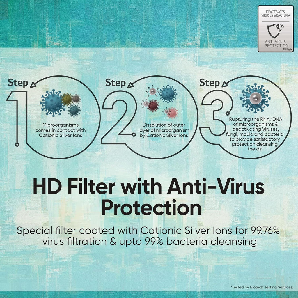 • HD Filter with Anti-Virus Protection: The HD filter is coated with Cationic Silver Ions (AgNPs) that deactivate more than 99% of viruses and bacteria, ensuring a clean and healthy living space.