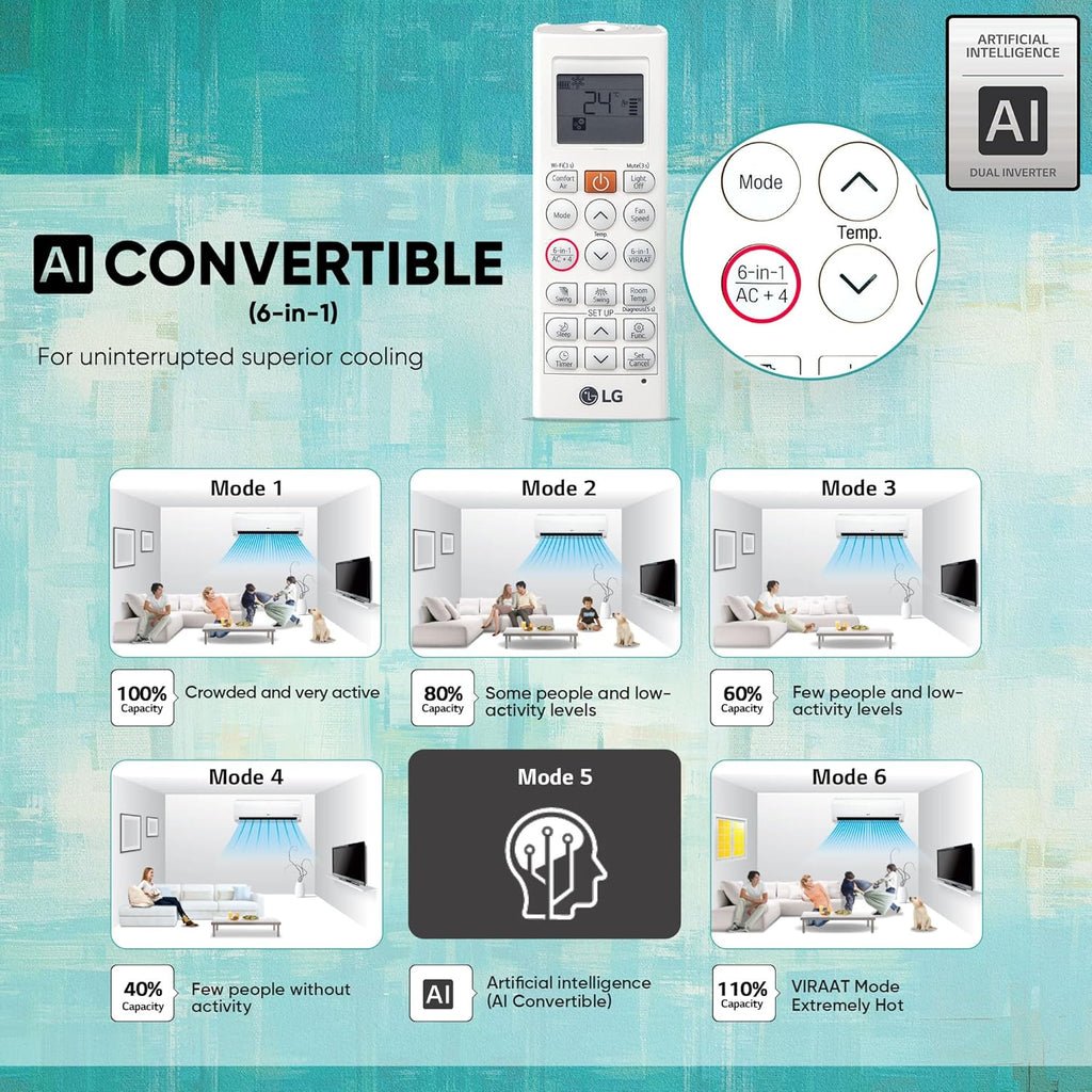 • AI Convertible 6-in-1 Cooling: Enjoy the flexibility to adjust the cooling capacity based on your requirements, from quick cooling to energy-saving modes. The AI technology analyzes your usage patterns to provide a personalized and energy-efficient cooling experience.
