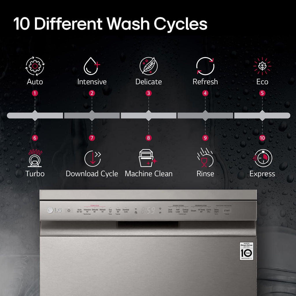 Wash Programs 10 (Auto, Intensive, Delicate, Refresh, Eco, Turbo, Express, Quick, Machine Clean, Download Cycle)