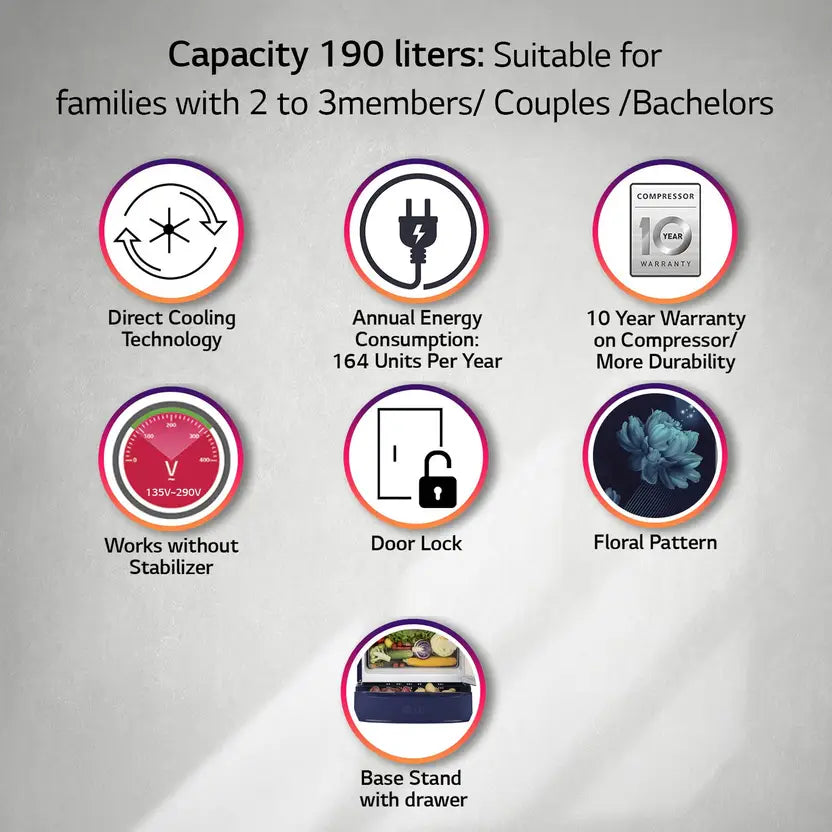 LG 185 L Direct Cool Single Door Refrigerator is a compact and energy-efficient cooling solution designed for small families and bachelors. It features direct cool technology for fast and effective cooling, along with a base drawer for convenient storage of vegetables. The refrigerator offers quick ice making, uniform cooling, and reliable performance with low power consumption. Its Blue Charm finish adds a stylish touch while ensuring practical everyday refrigeration needs are met efficiently.