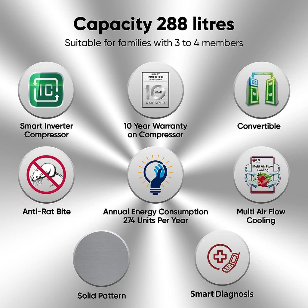 Experience ultimate freshness with LG's 288L Frost-Free Double Door Refrigerator. Its Smart Inverter Technology helps maintain the ideal cooling temperature to preserve food's flavor longer and helps save energy. With flexible Convertible option, you can use the refrigerator to store vegetables, fruits, and even beverages. Get the best of freshness and efficiency!