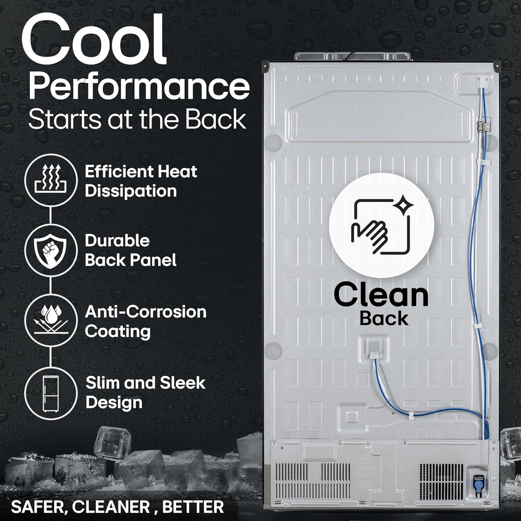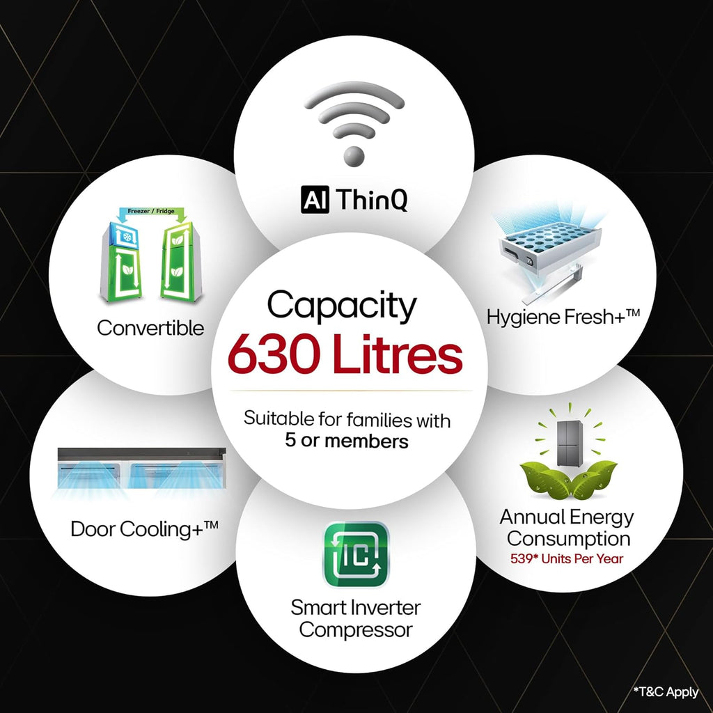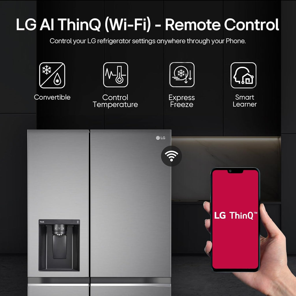 The LG GL-L257CPZ3 is a 630 litre side-by-side frost free refrigerator designed with Smart Inverter Compressor technology for efficient and quiet cooling performance. It features Wi-Fi connectivity with AI ThinQ for remote monitoring and control, along with DoorCooling+ and Multi Air Flow systems to maintain uniform cooling throughout the refrigerator. The appliance also includes a built-in water and ice dispenser, Hygiene Fresh+ filtration for improved freshness, and a SpacePlus ice system that provides additional storage space in the freezer. Finished in Shiny Steel, it is designed for large households requiring spacious storage and advanced cooling features.