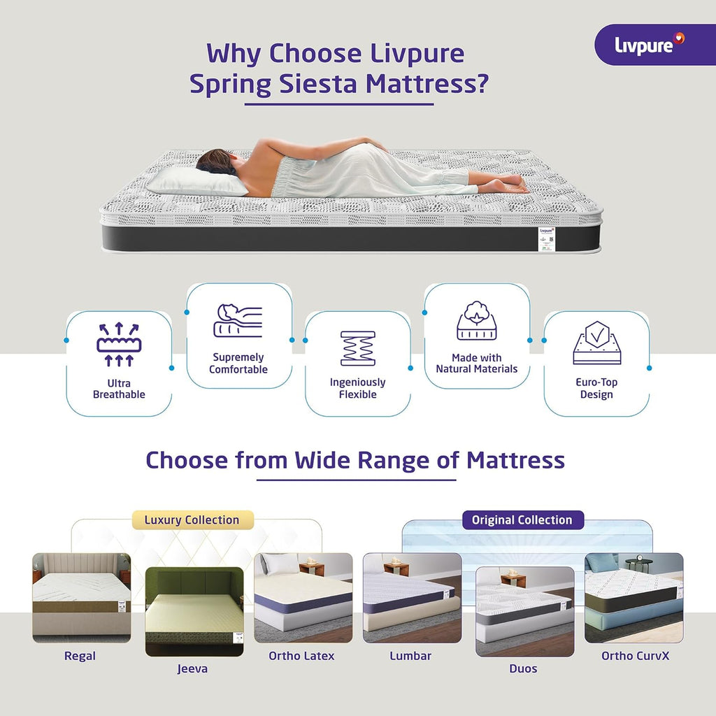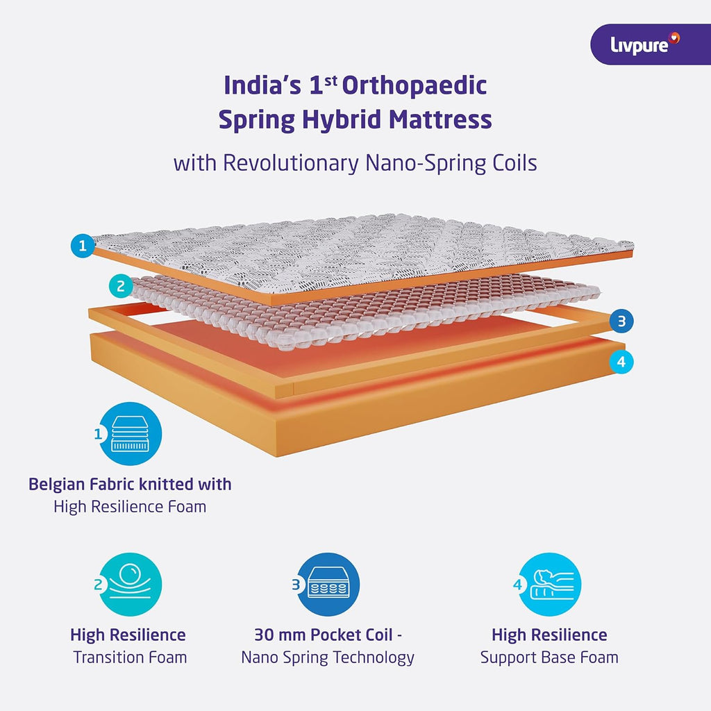 Experience the ultimate in comfort and support with the Livpure Smart Siesta Hybrid Orthopedic Spring Mattress. Designed with an Orthopaedic Nano-Spring System and euro-top design featuring plush quilting, this mattress offers unmatched comfort and targeted support for a restful night's sleep. Made with premium knitted fabric, it's not just a mattress, it's a luxurious sleep experience.