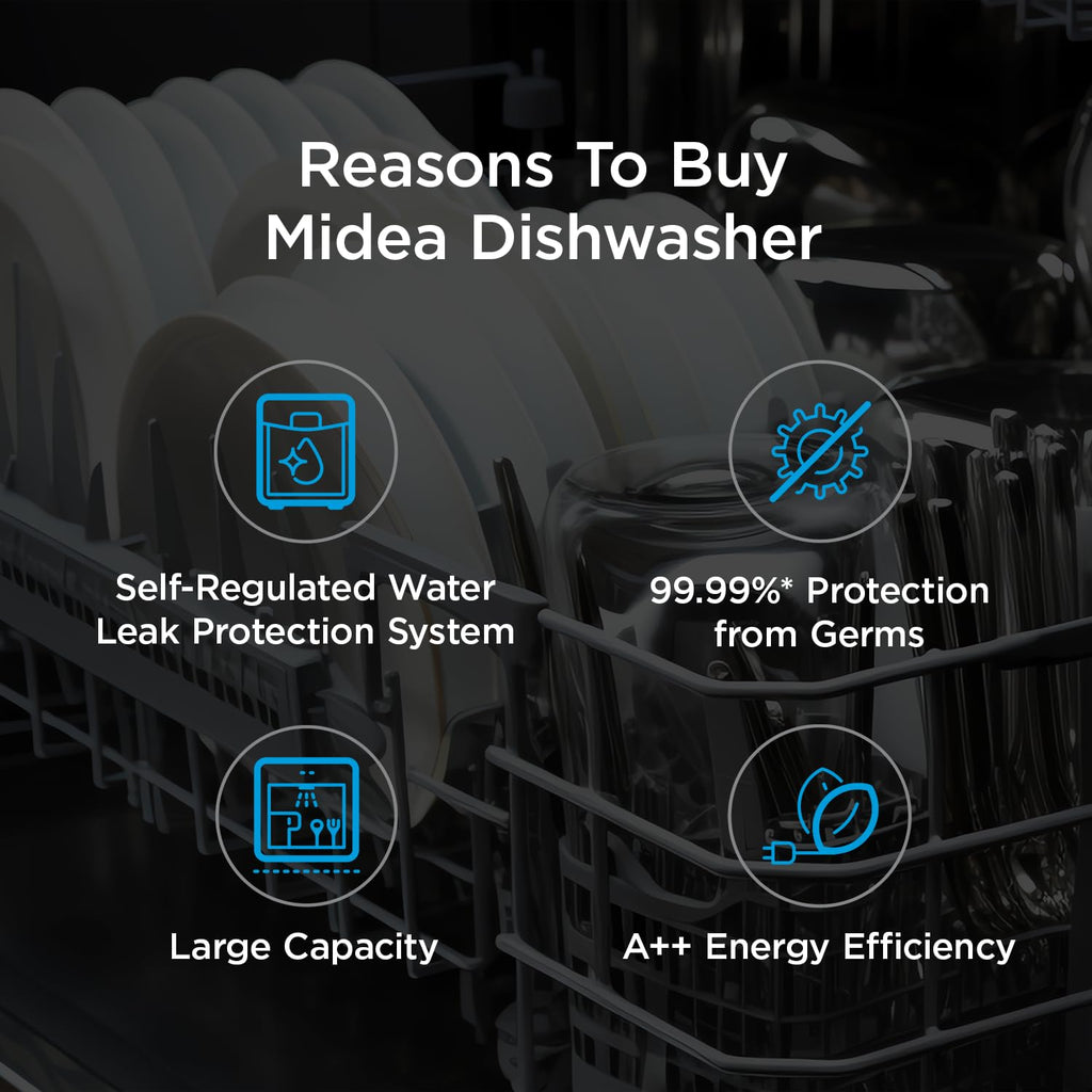 MIDEA 13 Place Setting Freestanding Dishwasher (MDWPF1301F(B)IN, Black,7 wash program, Child Lock, Extra Dry & Intensive 70 degree wash, A++ Energy Efficient,Delay Timer, Half Load, Adjustable Basket)