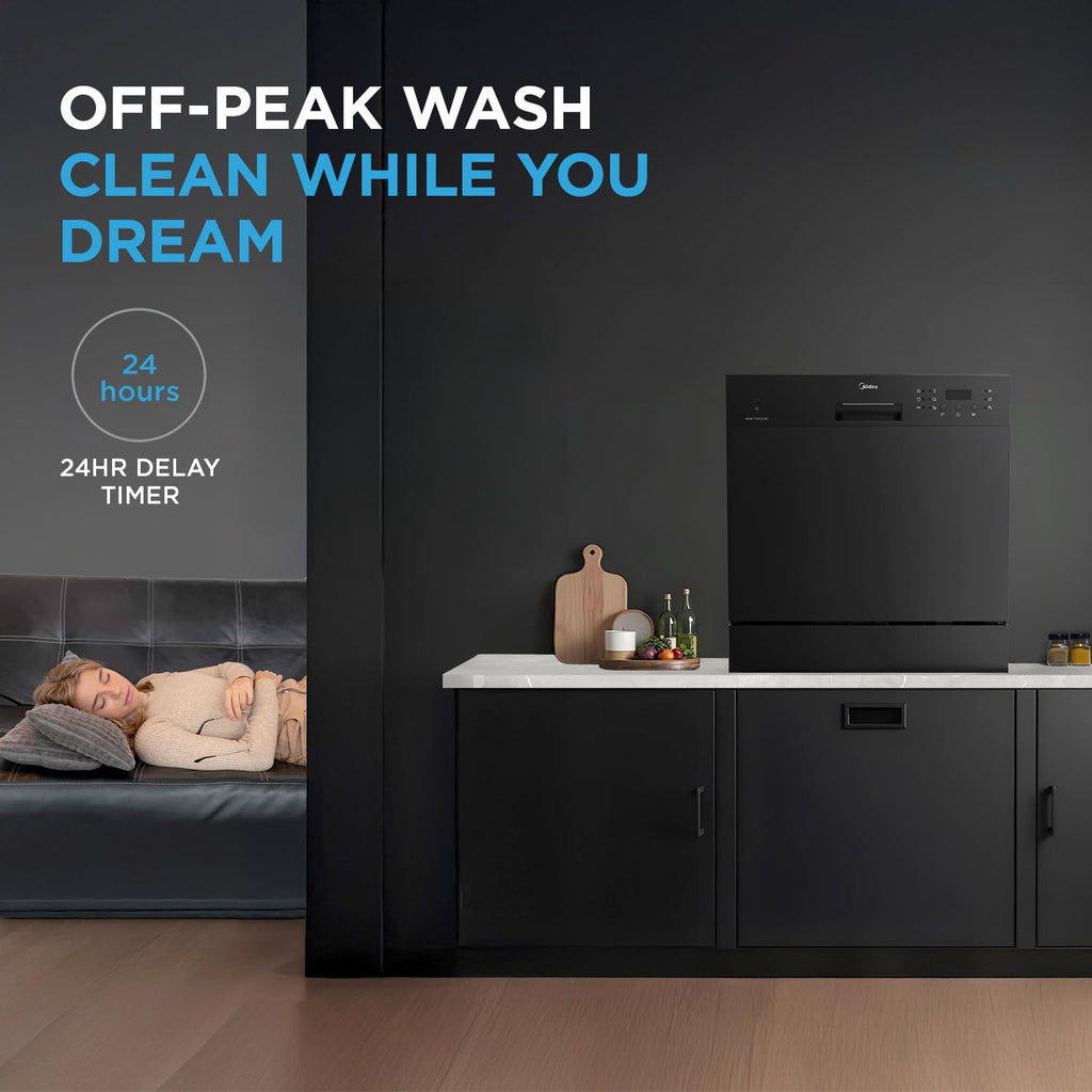 The  MIDEA MDWTT0802D(B)IN is an 8-place-setting countertop dishwasher in black with 6 wash programs including an intensive 70 °C mode for ultra-hygiene. It features an anti-bacterial filter, a 24-hour delay timer, portable installation and compact dimensions suited for small kitchens or families.
