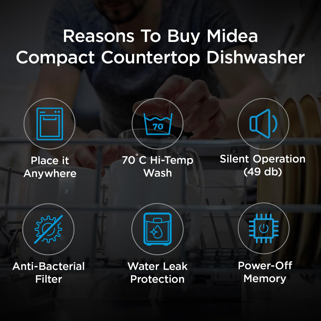 MIDEA 8 Place Setting Countertop Dishwasher (MDWTT0802D(B) IN, Black, 6 wash programs, Portable, anti-bacterial filter & Intensive 70 degree wash for Ultra Hygiene, 24 Hour Delay Timer)