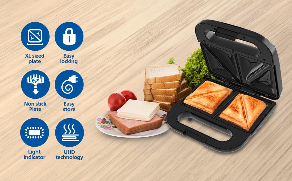 Philips HD1000/00 Sandwich Maker (800W) is designed for fast, even toasting with UHD (Uniform Heat Distribution) technology and non-stick XL plates. It features an easy-lock mechanism, ready-to-cook indicators and a compact, stylish black finish, making it perfect for quick snacks and everyday use.