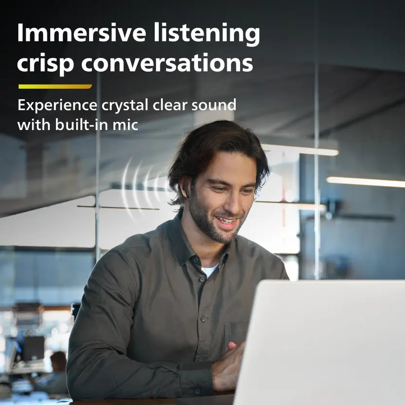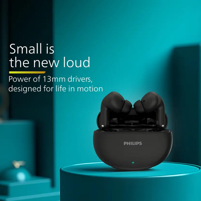 The PHILIPS TAT1269BK true wireless in-ear earbuds are designed for powerful sound and long-lasting everyday use. Equipped with 13 mm drivers, they deliver clear and impactful audio for music and calls. With up to 40 hours of total playtime, these earbuds support extended listening without frequent charging. Bluetooth v5.4 ensures stable connectivity, while touch and voice controls provide convenient operation. The IPX5-rated design offers protection against sweat and splashes, making them suitable for workouts and outdoor use.