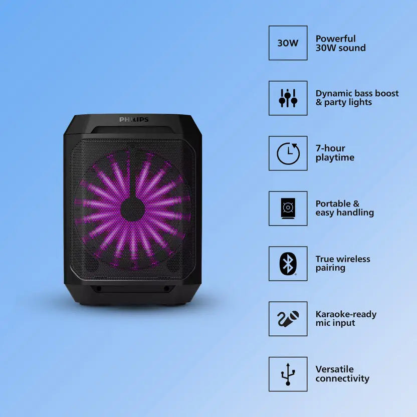 The PHILIPS TAX2208 Bluetooth party speaker is built to deliver powerful sound with dynamic bass output for music and entertainment. It features a 30 W audio output along with Dynamic Bass Boost for enhanced low frequencies. The speaker supports multiple input options including Bluetooth, AUX-in, and a wired microphone input for karaoke use. Equipped with a 3000 mAh battery, it is suitable for extended listening sessions and gatherings, making it ideal for home parties and events.