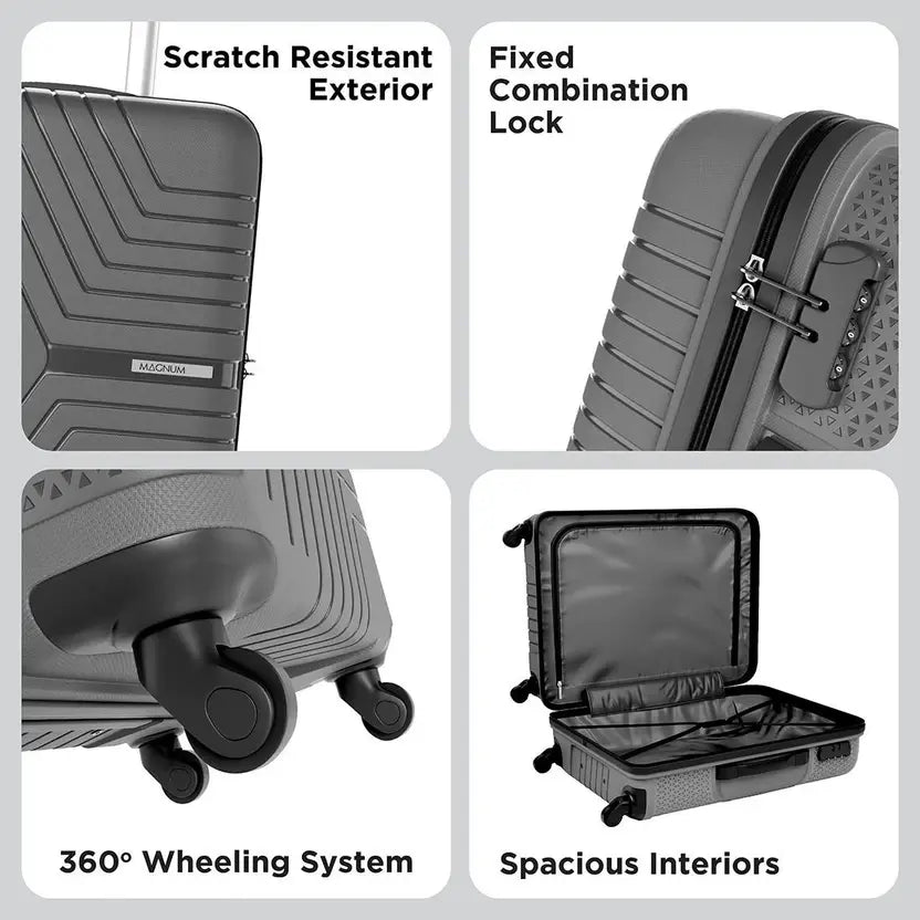 Other Features Fixed combination lock, Scratch Resistant, Lightweight, 4 wheels, Twin Side Packing, Polyester Lining