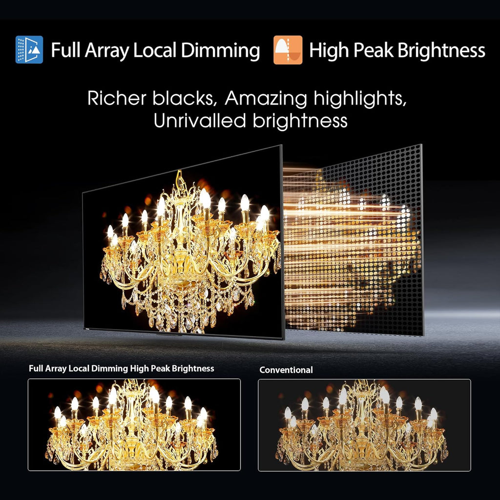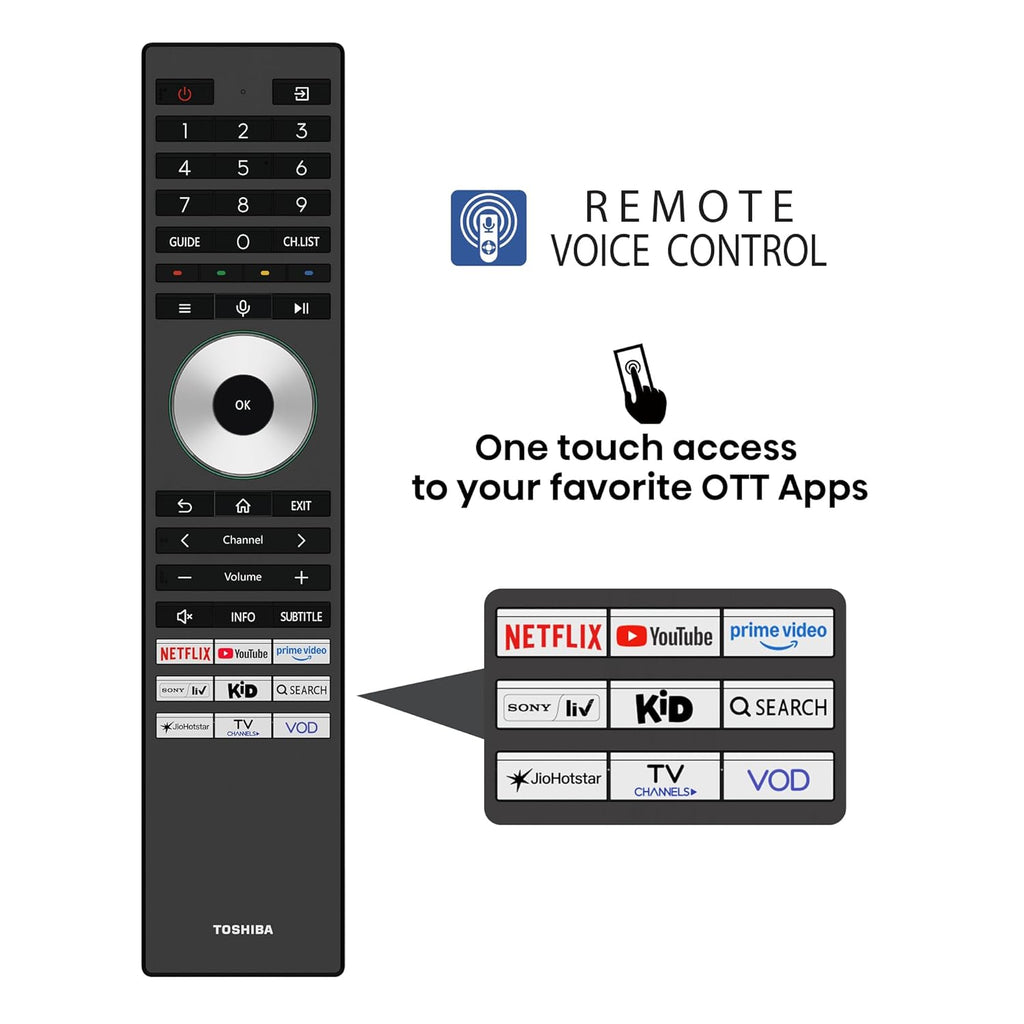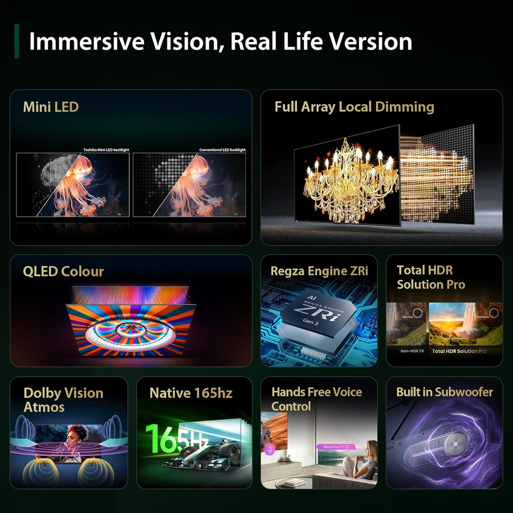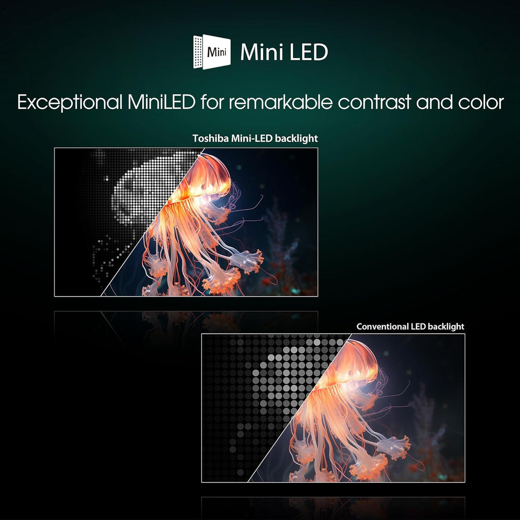 The TOSHIBA Z770RP Series 4K Ultra HD Smart TV features a 164 cm (65 inches) display built with advanced MiniLED QLED technology for enhanced brightness, contrast, and color accuracy. With 4K Ultra HD resolution, it delivers sharp and detailed visuals suitable for movies, sports, and immersive home entertainment. Its smart TV functionality allows access to online content and apps, while the premium design complements modern living spaces.