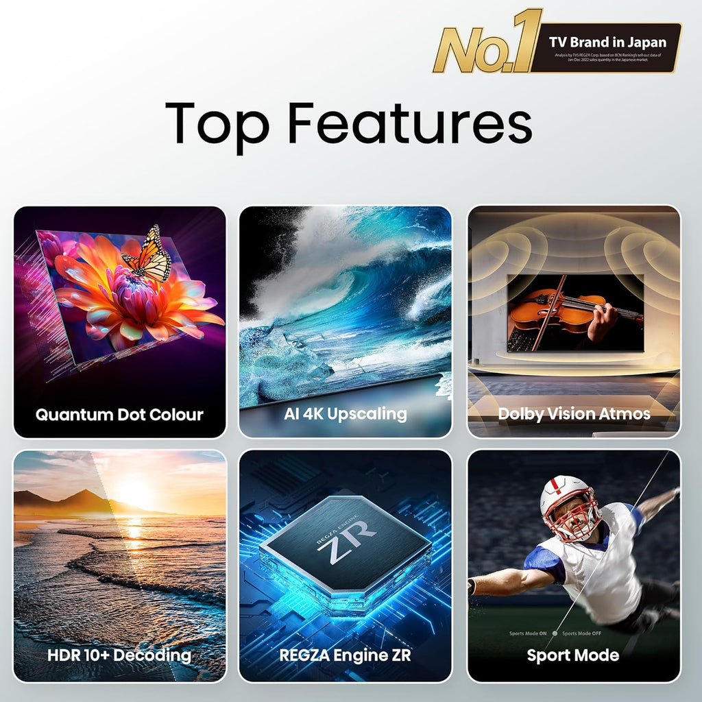 The TOSHIBA C450NP Series 4K Ultra HD Smart QLED TV features an expansive 215 cm (85 inches) display designed for a truly immersive viewing experience. Built with QLED technology, it delivers vibrant colors and enhanced brightness along with sharp 4K Ultra HD resolution. Powered by Google TV, it offers easy access to apps, streaming platforms, and personalized content. Its premium large-screen design makes it ideal for cinematic home entertainment, sports, and gaming.