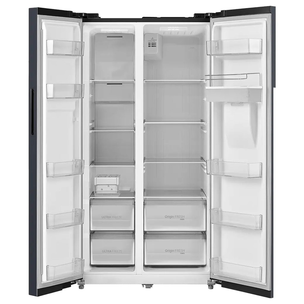 The Toshiba GR-RS682WE-PMI(06) is a 560 litre frost-free side by side inverter refrigerator in Morandi Grey with a built-in water dispenser. Designed for modern kitchens, it delivers stable and energy-efficient cooling with inverter compressor technology, Super Cooling & Super Freezing modes, and an exterior digital control panel for precise temperature management. The spacious interior and well-organized storage make it suitable for larger households.
